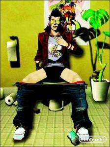 In a recent interview with Suda51, a few new screens came to the fore, mostly concept art. What also appeared is the picture above, with Travis sitting on a toilet, trou dropped, staring at the audience. This is hardly a new pose for males, and it automatically brought to my mind a few other books I’d read and classes I’d taken.