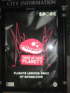 The ad is fairly straight forward and while it hints at the gameplay for anyone who follows games and has known about Spore, I’m not entirely sure the average passerby would know what to make of this. The only real indicators that this is a game are the small EA logo and ESRB rating in the lower right and left hand corners, respectively. In fact, the lack of any gaming indicators in the main image is what caught me by surprise and had me thinking it was just an advertisement for a travel agency of some sort (those types of advertisements proliferate Chicago).