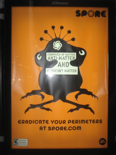 This time I knew for what I was looking and it stood out to me, even though I passed it as it faced my back in front of the Oriental Theater in Chicago’s ‘Theatre District’ (where I find the least interesting theater in Chicago being performed). Again, if I had no idea what Spore is, I could easily remain ignorant of the logo and ESRB rating and just be curious as to what is staring at me. This one’s text had me in even further thought.