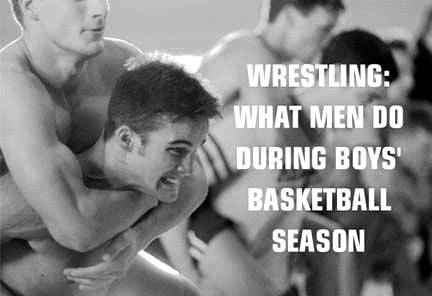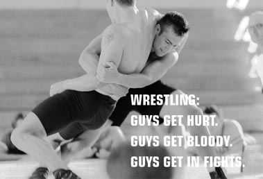 Beyond questioning the typeface of this ad (the word fights gets hard to read), it’s pretty clear what the ad is trying to get across. Wrestling is a man’s sport, full of blood and fighting. Pain is a masculine thing. At the same time, the model whose back is toward us has half of his singlet off, which creates an interesting juxtaposition of contact between the two men (though not if we consider the Ancient Greek style of wrestling).