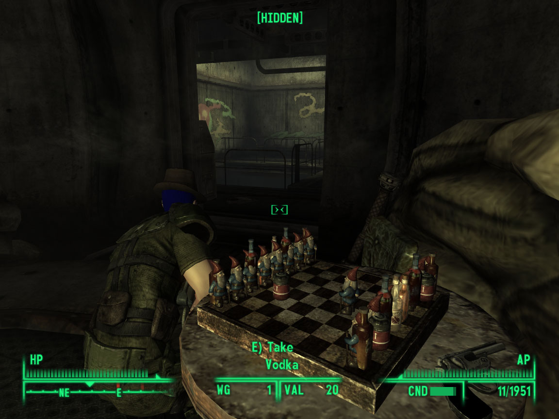 One of the portions of the game that just had me stop and laugh for a good while (then take a screenshot) was in a later communications tower, where I came across a makeshift game of chess played out with garden gnomes and bottles of alcohol (the variety of alcohol in the game is true to gaming form). Did someone find a pre-war book on chess and put together this rather odd game? Perhaps it was put together by a survivor who kept the tradition alive via introduction of the board to new people. Chessboards are one item that proliferates the world, but what context does it offer the player, who may have never encountered it, or at the very least, the pieces with which to play it?