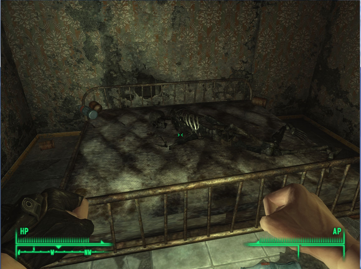 This scene from above is rather familiar in Fallout 3: a skeleton on a bed. The variance comes in whether or not there is more than one skeleton, what items are strewn on the bed with him or her, and where this location is. Just as likely for the player to find is a skeleton in a bathroom, sunk down in the tub; while the skeleton who is surrounded by empty bottles of whiskey in the bathtub offers a morose sense of humor, it makes me wonder what happened to those skeletons who don’t have that sense of liquid courage. Were they peacefully taking baths when the nuke hit, cowering in fear because they couldn’t get into a vault?